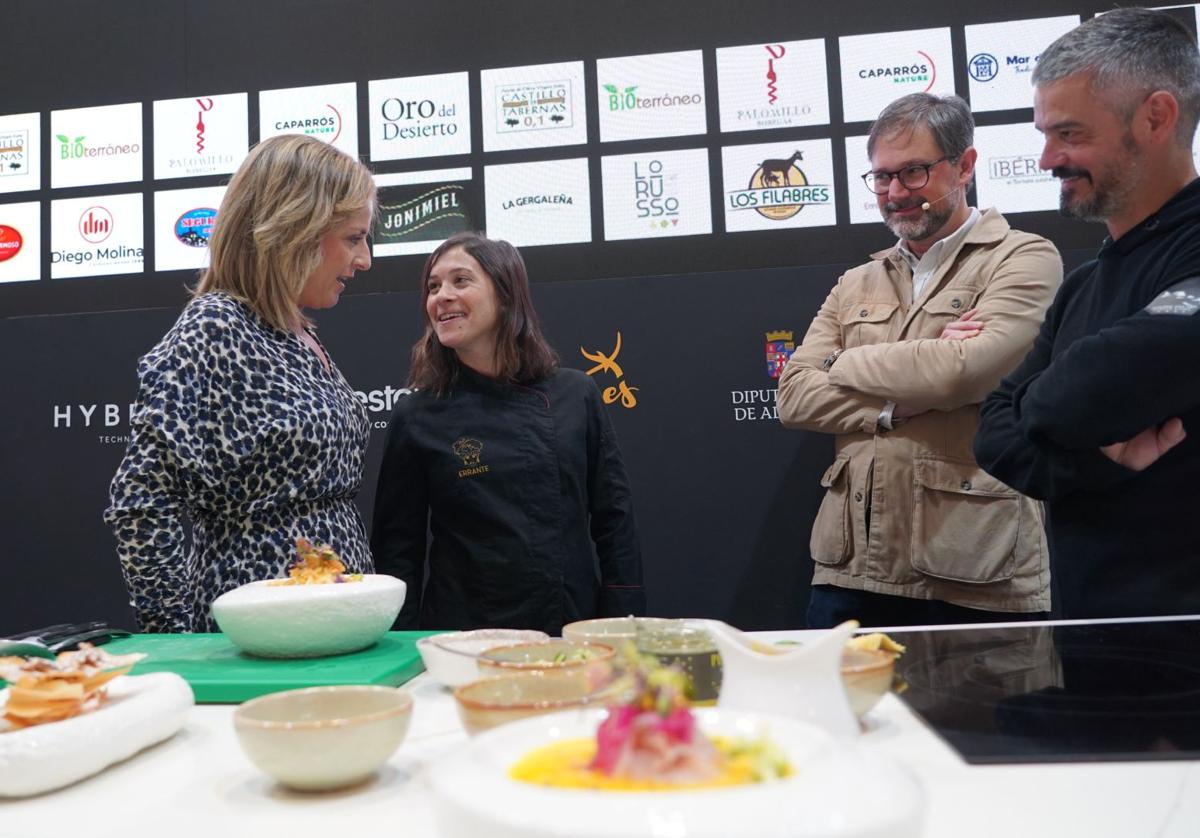 Las actividades del stand de 'Sabores Almería' comenzaron ayer con el showcooking de la chef Belén Ibáñez, del Errante, un establecimiento que se ubica en el barrio de la Plaza de Toros de Almería. En su demostración compartió la esencia de su negocio, donde los sabores de Almería se fusionan con los de otros países del resto del Mediterráneo o de Asia. Preparó una lasaña wanton de gamba roja y vieira, tiradito nikkei de gallineta del Mar de Alborán y tarta árabe 'a mi estilo'.