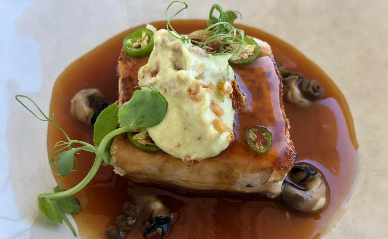 Con el bonito del norte, Arriaga mira a su tierra. Y es que se ha cansado de la burbuja del atún. El bonito es un producto top de verano y está de plena temporada. «Cuando se va la anchoa, llega el bonito», explica Álvaro, que prepara un lomo y lo acompaña con el caldo de un marmitako clásico al que añade caracoles de mar. Se acompaña con otro producto muy vasco: la piparra, la guindilla fresca, en forma de suave emulsión.