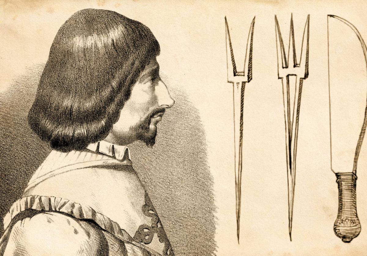 A diferencia del gañivete (que era de uso personal y solía ser acarreado en un estuche por los invitados), aquellos tenedores primigenios formaban parte del instrumental del cortador, al igual que los cinco cuchillos básicos que Villena recomendaba para trinchar y otros dos utensilios de aplicación muy específica: el perero, que era un soporte para mondar limpiamente membrillos, peras o manzanas, y el pungán, un instrumento de punta fina con el que se abrían las ostras y se comían los caracoles.
