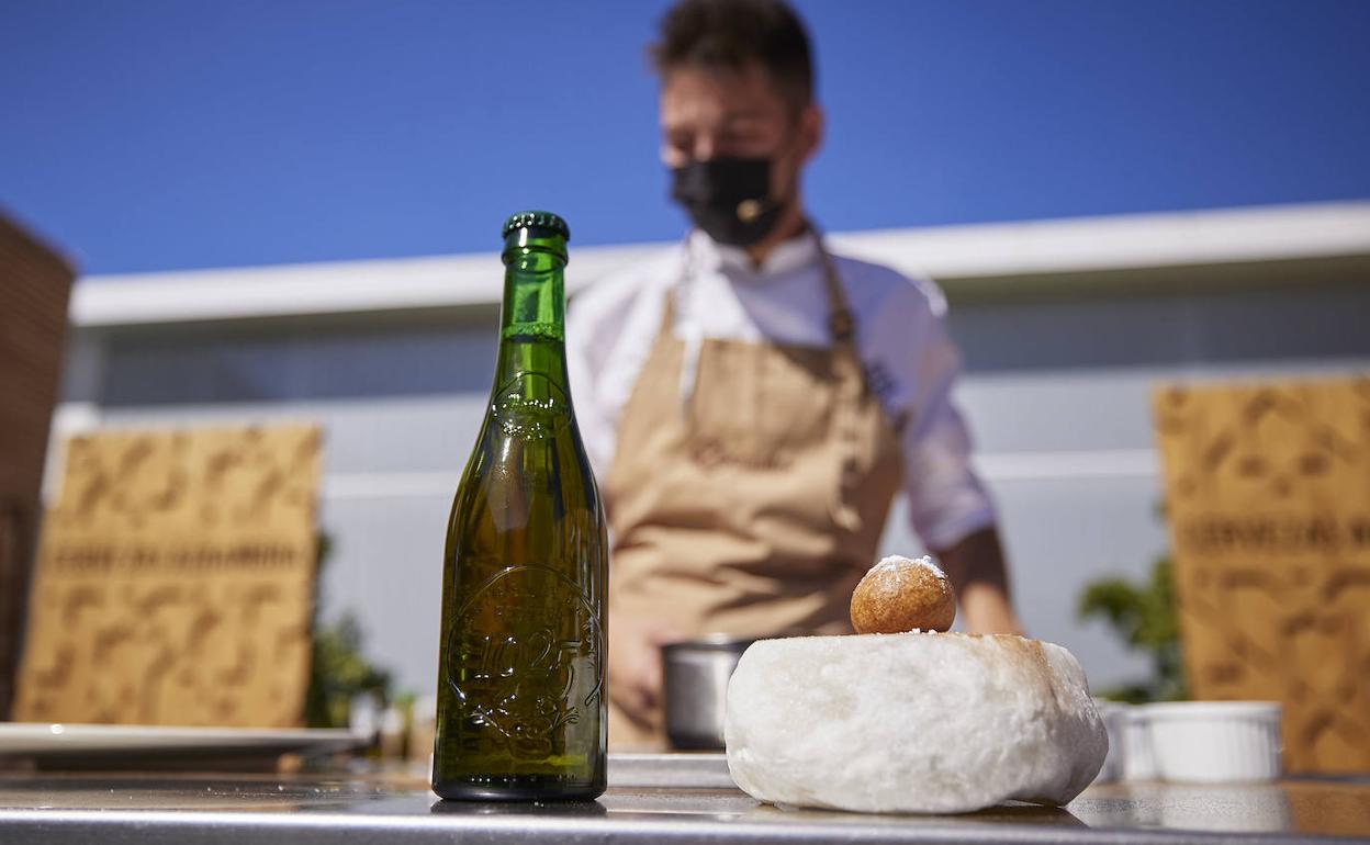 Los cocineros prepararon frente a los asistentes al evento tres latos tradicionales de la tierra para acompañar a tres de las variedades de Cervezas Alhambra con las que lograron sorprender al público presente. El primero de ellos, un buñuelo de pastela mozárabe. Un plato con un marcado toque andalusí que Arroyo y Sánchez acompañaron de uno de los buques insignias de Alhambra, la 1925.