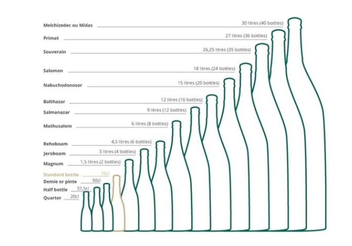 La más pequeña, aparte de las de licores del minibar, aviones y demás medio de transporte con catering, son las ¼ de botella. Se usan para vinos y espumosos como el 'benjamín', habitual en el cava. O en vinos del self service de autoservicio. Su capacidad es de 187,5 ml. El contenido no mejora. Al contrario, se oxida rápidamente. Le sigue la mal llamada 'media botella'. Solo tiene 375 ml. El contenido de las habituales botellas de vino y espumosos son 750 ml, el tamaño estándar. Le sigue el Magnum, ideal para una suculenta comida con carnes, potajes, quesos curados, etc. El contenido 1,5 l, equivalente a dos botellas de 750 ml.