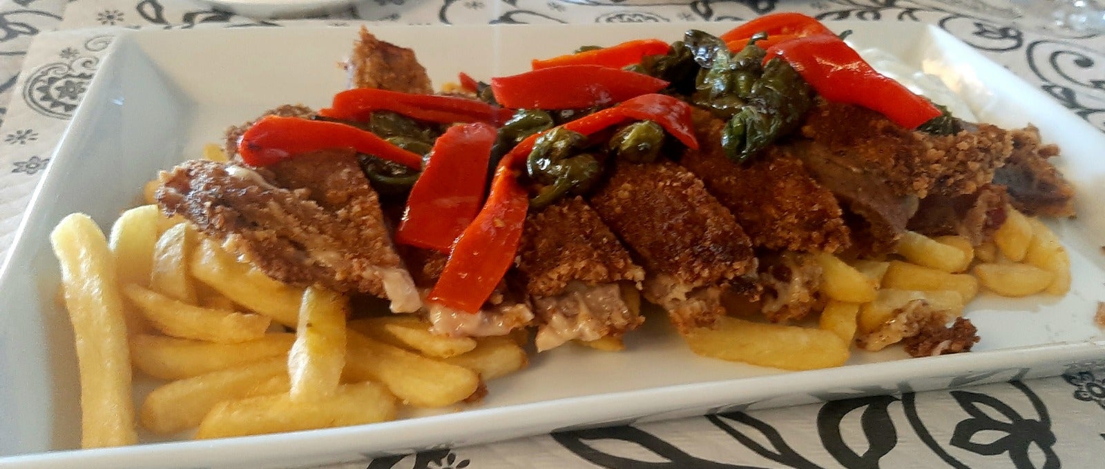 Ingredientes: Dos filetes de ternera, harina, huevo, pan rallado, pimientos del piquillo, patatas fritas, pimientos verdes fritos, y queso, jamón asado, pimientos asados y jamón serrano para el relleno