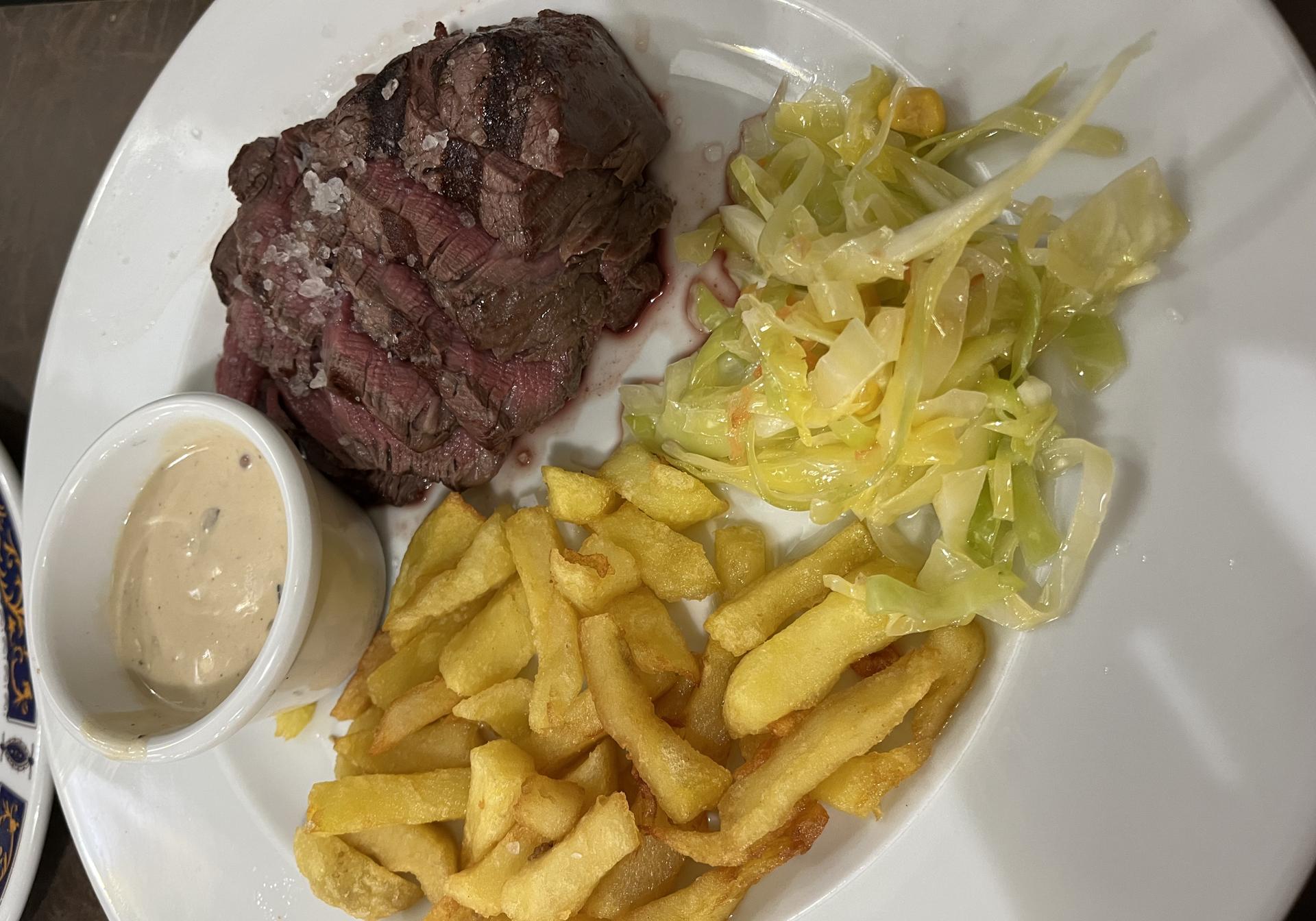 Empezamos por un soberbio remojón granaíno, de los mejores que he tomado. A este plato, por cierto, deberíamos dedicarle un reportaje en exclusiva. Seguimos con otro clásico de la gastronomía de la tierra: las habas con jamón y huevo. Y terminamos, cómo no, con una de las proverbiales carnes que tanta fama han dado a Mesón Alegría: un excepcional solomillo de ternera poco hecho con sus patatas fritas y su salsa aparte. Un auténtico festín.