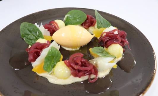 Elaboración: Para el jugo de aceituna trituraremos las aceitunas, lo pasaremos por el colador y texturizaremos. Confitamos el bacalao a 70 grados unos 5 min. Para la brandada de bacalao tostamos los ajos picados en 50 ml de AOVE y confitar en el aceite restante a 70 grados la patata cortada en bolitas. Escurrimos y juntamos todos los ingredientes en el robot para llevarlo a emulsión durante 3 minutos. Enfriamos y guardamos en una manga pastelera. Para emplatar dispondremos de la brandada haciendo una circunferencia. Colocar encima los gajos de naranja, la cebolla morada encurtida, unas lascas de bacalao confitado, las hojas de espinacas, unas escamas de sal Maldon y bañamos con aceite arbequina. En el centro del círculo colocaremos una bolita del sorbete de naranja y terminaremos pintando el plato con el jugo de aceituna.