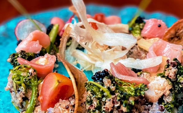 Cuatro chefs granadinos proponen distintas opciones en esa línea, como el de Amazonia Fine Food, cuyo ambiente y decoración selvática –que une lo verde con la madera– ya invitan a degustar platos saludables y vinculados con la naturaleza. Y más aún en el emblemático entorno en que se emplaza, en plena Carrera del Darro, frente a la Alhambra y el bosque que la rodea.
