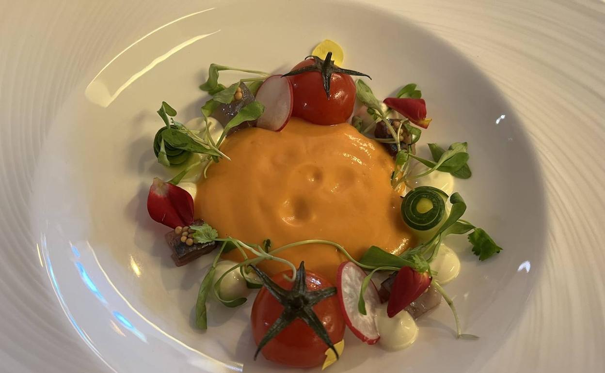 Una de las cosas que más me gustan de los menús de Chechu es que siempre encuentra platos para maridar con alguna de las Cervezas Alhambra, que la tierra tira mucho. En este caso, la Citra IPA sirvió para acompañar la presentación en sociedad culinaria de uno de sus nuevos escabeches. ¡Y menuda 'escabechina' hizo con la calabaza en texturas y erizo de mar! Por Málaga, una versión de la porra antequerana con sardinas ahumadas, vinagreta de mostaza y toque de cilantro. Un plato, además de exquisito, muy instagrameable.