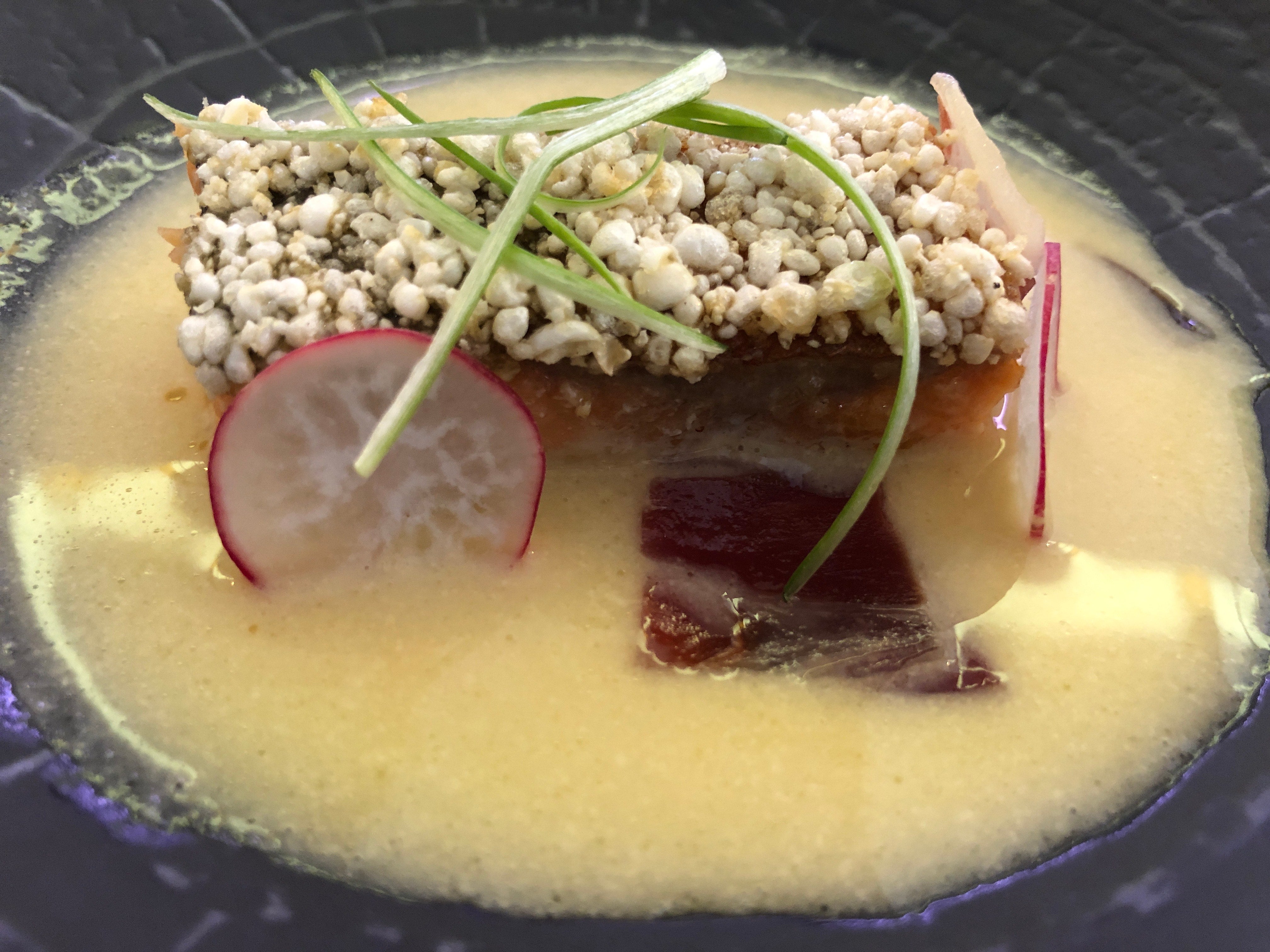 La otra granada de mano con espoleta que prepara Chechu también tiene denominación de origen granadino: trucha de Riofrío con piel de torrezno y gazpachuelo ibérico. Otra fusión que apuesta por el contraste de sabor y por unas texturas singulares. ¿Dónde se ha visto una trucha que se vista con piel de torrezno, fundiéndose en vivo y en directo delante del comensal? Un plato que exige afinar mucho en sala para que llegue en el momento justo a la mesa. Y el gazpachuelo, con el ibérico haciendo de las suyas y diciendo eso de «¡Cómeme!».