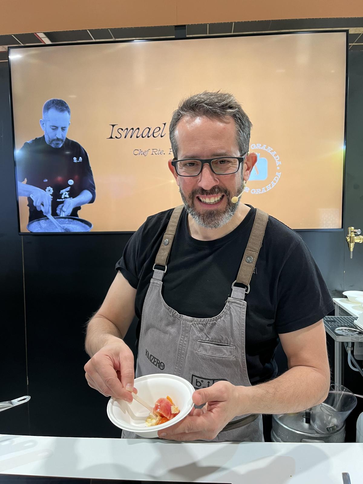 Más granaíno no puede ser. Al desayuno que Ismael Delgado, el cocinero del restaurante Portal El Bajo I ha preparado cada mañana en la apertura ... del stand de Sabor Granada, el sello gastronómico de Diputación, en Madrid Fusión.