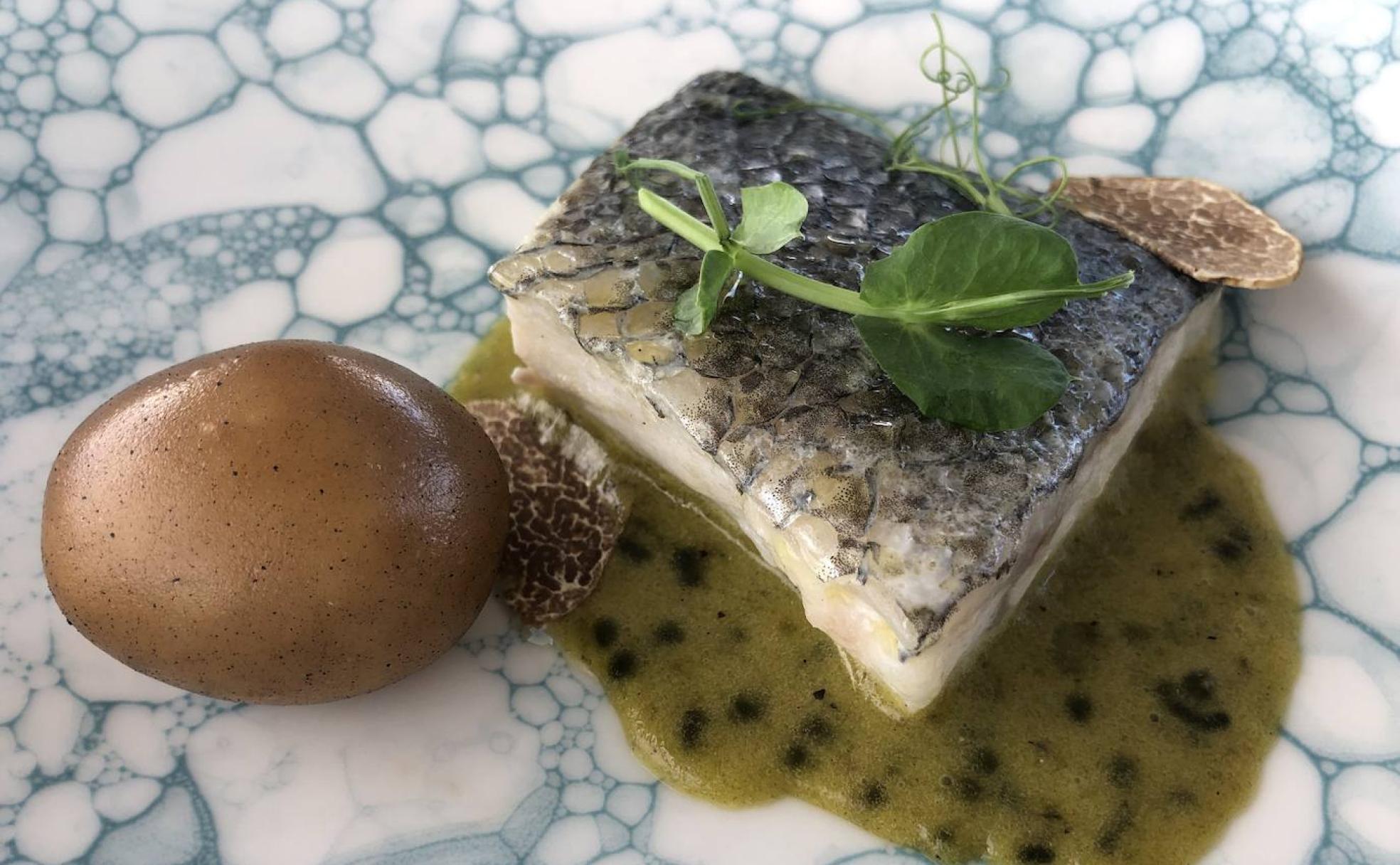Más lujos: el hígado de pato en escabeche de trufa negra sobre pan brioche de naranja. Siguió un arroz meloso de bogavante y mantequilla salada de su coral y llegó el pescado: la lubina, trufa blanca, patatas con piel y holandesa de codium. Si me obligaran a elegir un solo plato de todo el menú, creo que me quedaría con este. Solo por educación y decoro me abstuve de lamer la superficie ya limpia de la fuente en que venía la lubina, que rebañar la holandesa con pan... bien que lo hice.