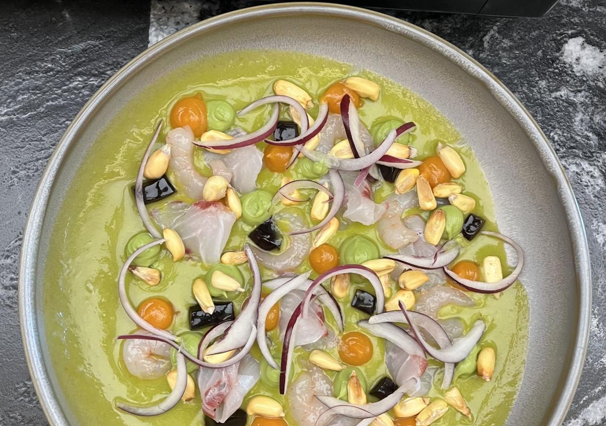 Fuimos un sábado a mediodía y estaba todo lleno. Pero es un lleno agradecido, tranquilo y relajado. Sin bullas. Nos sentamos en nuestras elegantes y cómodas banquetas, pedimos unos vermús y empezamos a bichear la carta. Había un plato fijo que teníamos que probar: el aguachile de corvina y gambas. Es uno de los muy instagrameables, llamado a convertirse en icono, y necesitaba comprobar que estaba tan bueno como pintaba en la foto. ¡Y a fe que sí! Un platazo.