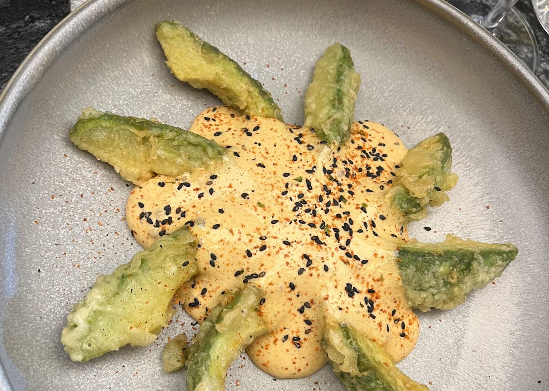 De entre los entrantes también pedimos una ostra con maracuyá y tomate de la que no les voy a hablar porque del 'capítulo ostra' me gustaría hacer un especial. O sea, estaba espectacular, ojo. Vayamos a falsas interpretaciones. Pero ya les digo que de este producto quiero hablar otro día. Y probamos las gyozas de gamba blanca con jugo de su cabeza y una espectacular tempura de aguacate con espuma de kimchi y tierra de calamar.