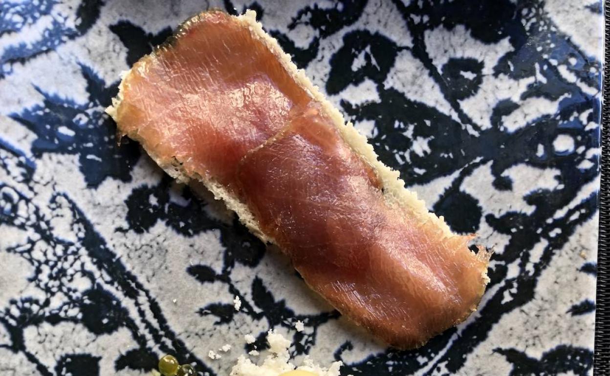 El siguiente plato es un espectáculo. Se llama Tabernero y es una actualización de los bocados típicos de taberna en clave de cocina contemporánea. Un ejemplo extraordinariamente acabado de la conexión entre tradición y vanguardia. El Pantunaca es un jamón serrano fundido sobre una galleta crujiente con tomate. El queso se acompaña de esferificaciones de aceite y remata un ravioli de tocino, tomate y albahaca. Una gozada, ya les digo.