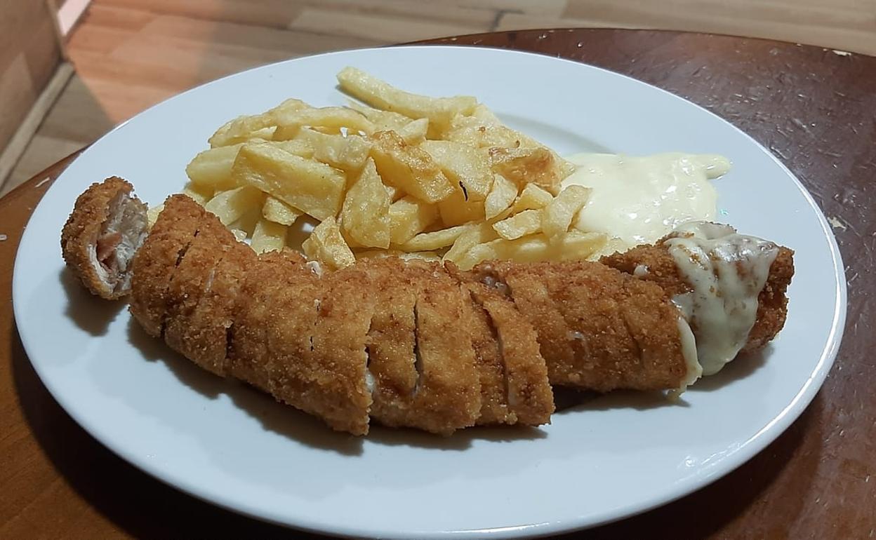 Ingredientes: Pieza de cerdo, jamón serrano, pan rallado, huevo, patatas fritas, mayonesa hecha en casa.
