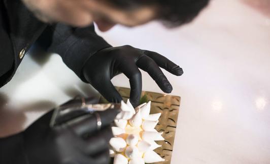 Ponemos en el plato de presentación el ajoblanco de chirimoya, encima colocamos el crujiente de jamón churruscante y el cebollino y ya está listo para comer.