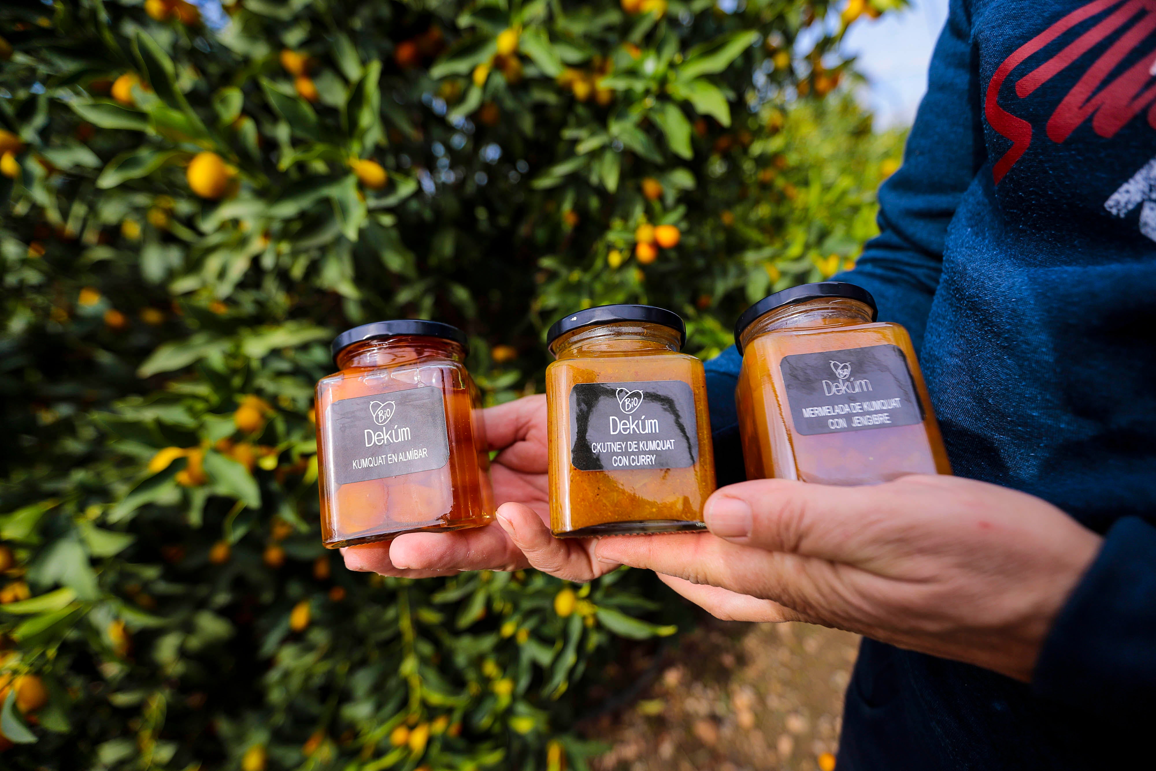 Además de comercializarlas como fruta fresca de producción biológica, en Dekúm hacen elaboraciones. Comenzaron por preparar almíbares y siguieron con mermeladas, que tienen un sabor intenso y fuerte. La cáscara está cortada en cuadraditos y se queda dentro, por lo que al morderla, tiene todo el sabor de la fruta. Es como la mermelada de naranja amarga, pero sin tanto amargor.
