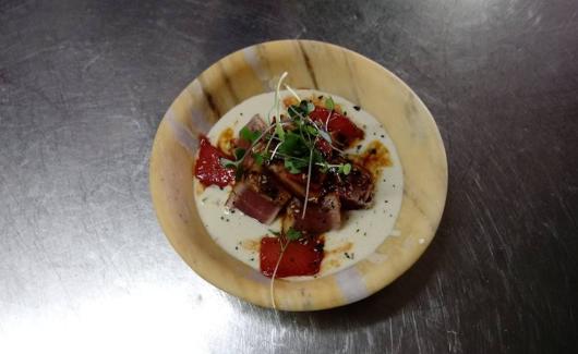 Tataki de atún sobre ajo blanco de almendras y salteado de fresas al vinagre de Jerez, de Jorge Matas