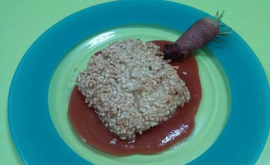Elaboración: Desalamos el lomo de bacalao, y lo limpiamos. Lo pasamos, por la parte sin piel, por la harina, tempura y almendras picadas, y lo doramos en aceite de oliva. Se colocan los lomos en una bandeja de horno con la cara de la piel hacia abajo y se hornea a 180º. Para el crujiente de jamón, necesitaremos moldes cónicos de aluminio en los que enrollaremos las lonchas de jamón y se hornean hasta quedar crujientes. Para la presentación, desmoldamos los crujientes de jamón y colocamos en un plato llano un poco de salsa de tomate, preferiblemente casera, con tomates de la Vega, un poco de sal, azúcar para contrarrestar la acidez y aceite de oliva virgen extra. Encima colocamos el lomo de bacalao y emplearemos el jamón como acompañamiento, incluso se puede rellenar al gusto, ya que la forma cónica permite bien encajar más ingredientes o elaboraciones.