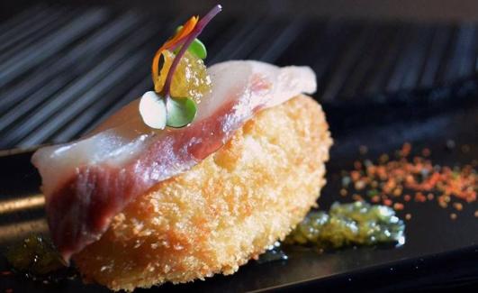 Falsa croqueta de ajo blanco con jamón de Trevélez y esturión ahumado de Riofrío Javier, de San José