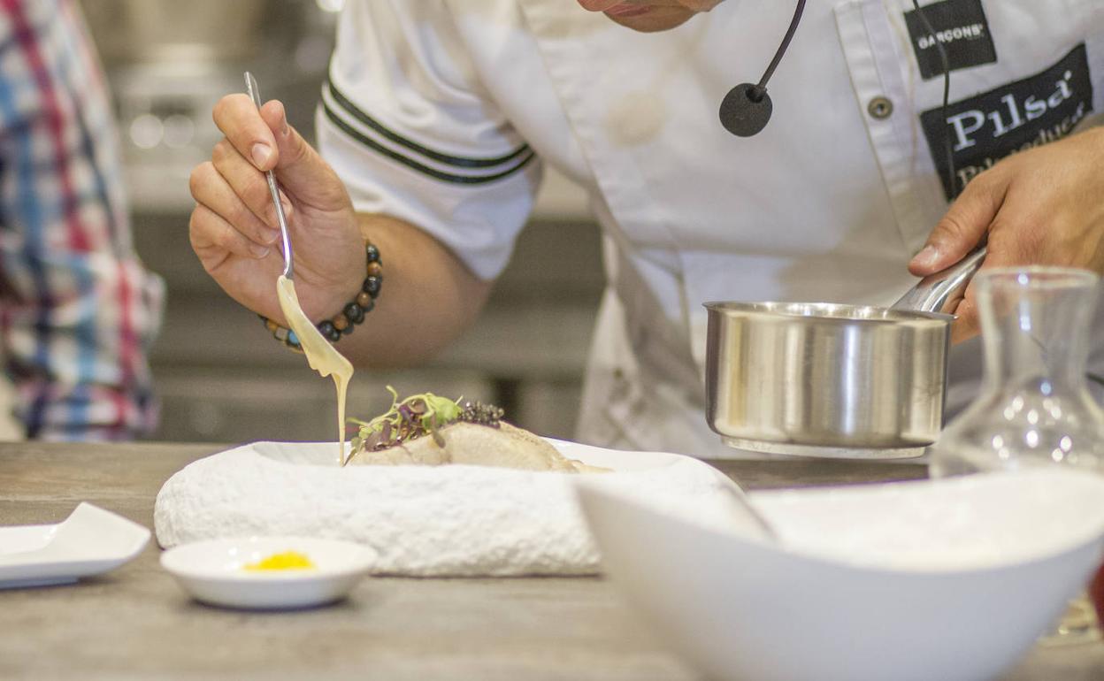 Como buen aceite gastronómico que es, Carlos Caballero usó Amarga y Pica para preparar un plato de esturión cuya base es una salsa provenzal, con color rojo. Muy fondeada. Trabajó con el esturión confitado, que es la mejor técnica para este pescado, dándole consistencia con el Amarga y Pica. Y para mostrar la versatilidad del aceite, el director de Pilsa Educa usó mantequilla de aceite y remató con unas esferificaciones del propio aceite de oliva.