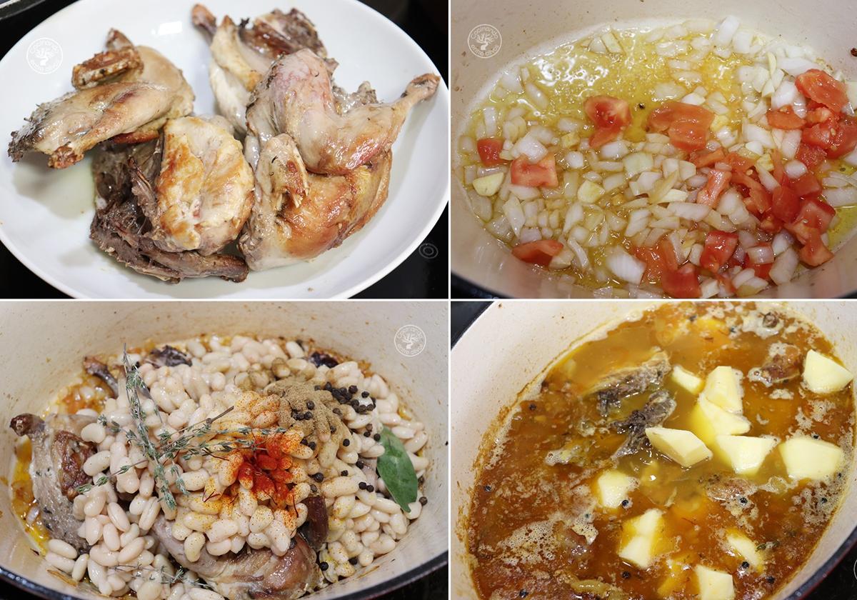 En una cazuela con aceite de oliva virgen extra doramos la perdiz, sacamos y reservamos. En la misma cazuela ponemos los ajos, la cebolla y el tomate picado y sofreímos con una pizca de sal. Incorporamos la perdiz, las habichuelas cocidas, el azafrán, tomillo y unos granos de pimienta negra.