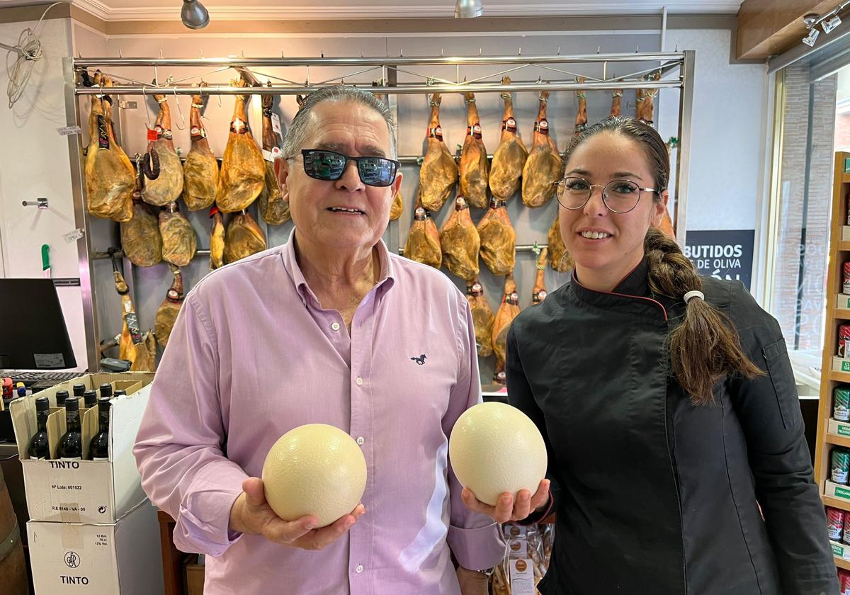 Saray Amador atiende tras el mostrador. «Son huevos de avestruz de una granja que hay en Cuevas del Campo, por la zona de Baza. Los primeros de la temporada, que las avestruces solo ponen con el calor», nos dice.