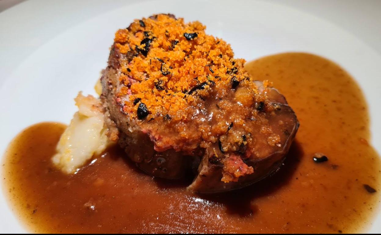 Para el pescado, una Trucha del río Guardal rellena de espinacas y jamón con salsa de tomate e hinojo y la carne reivindicó el producto granadino: Aguja de cerdo San Pascual con migas de picual, cassis y su jugo de moscatel.