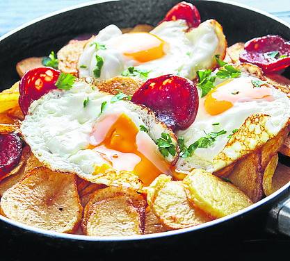 Acompañados de patatas fritas y jamón, son quizá, uno de los platos más socorridos de la gastronomía española. Freímos los huevos, que no deben quedar muy hechos, para poder romperlos con una cuchara de madera en la sartén donde hemos preparado las patatas fritas o en el plato.