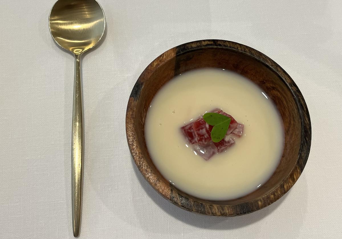 Acelgas y navajas, un microrrelato en sí mismas, y el espectacular gazpachuelo frío de moluscos. Un menudo de choco y otro de mis bocados favoritos de la vida: el puerro a la brasa con escabeche de boletus y trufa. Entre las carnes, un soberbio canelón de pato con calabaza escabechada y un minimalista ciervo y mostaza que era una explosión de sabor.