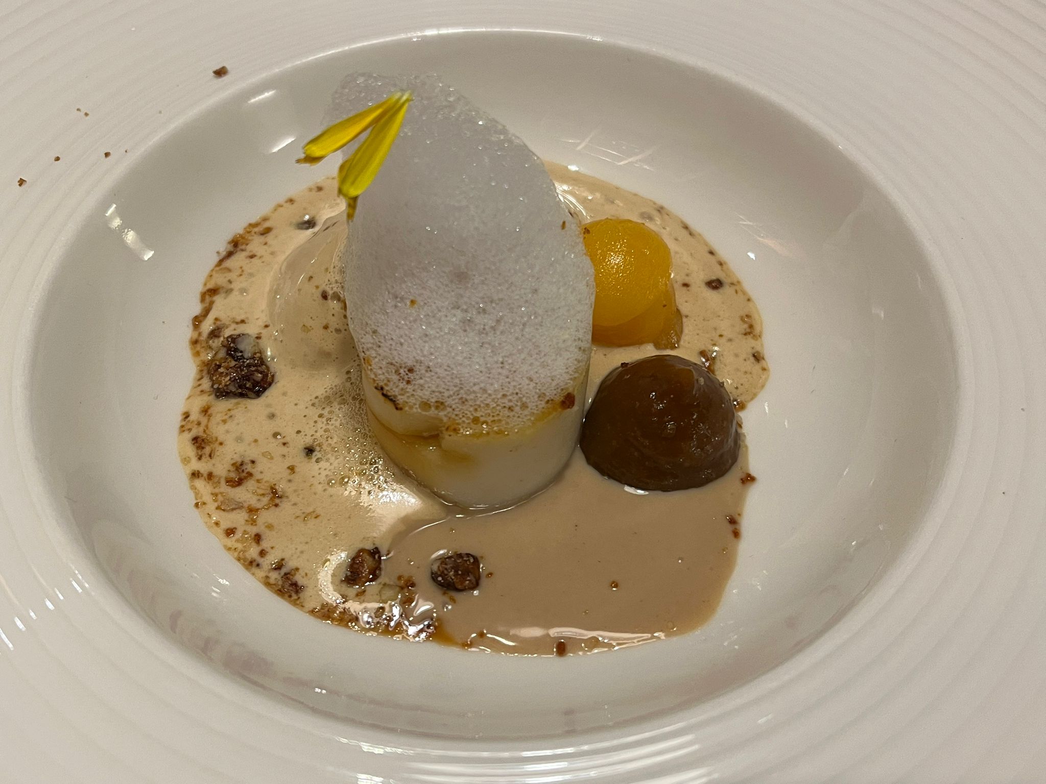 Como otras veces, no les voy a detallar el menú completo. Apenas unos trazos para mostrar la versatilidad y variedad de los selectos productos locales que desfilaron por la mesa. Como el carpaccio de cerdo San Pascual, el de Dúrcal, con requesón y el ácido de la manzana o el muy sorprendente sedoso de chirimoya , esturión de Riofrío y ciruela que condensa la fruta de la Costa Tropical con la potencia de sabor de una de las joyas del Poniente granadino.