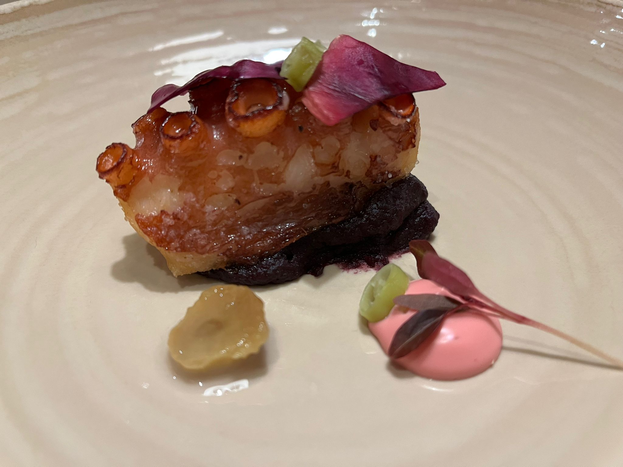Me encantaron también las mollejas de ternera, boniato y champiñón, un plato muy, muy atrevido que sale airoso del embite y, por supuesto, el pulpo de Motril, col y ajo. Y entonces llegó uno de esos platos de carne que silencian la mesa y reclaman toda la atención: civet de vaca pajuna de Sierra Nevada, patata, kale y holandesa. ¡Tremendo!
