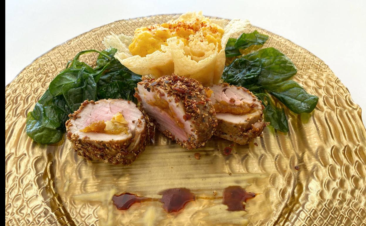 Mousse de calabaza con makis crujientes de solomillo y brie