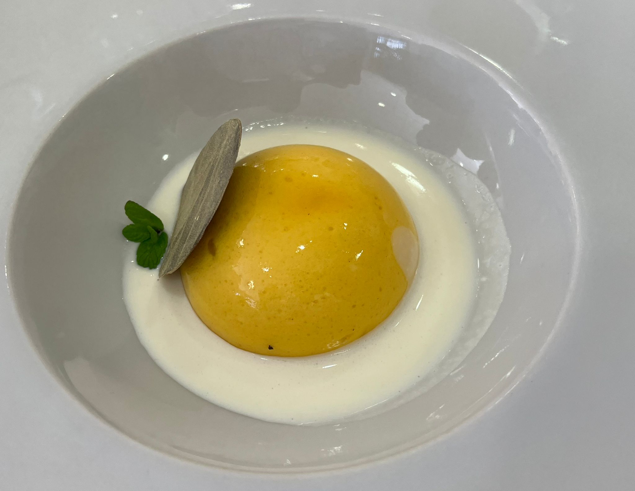 Y para el postre, más producto de cercanía: semifrío de mango y fruta de la pasión, melocotón con sopita de yogur y chocolate blanco. Brindamos con un excelente espumoso de Bodega Carayol y Castelar de Galera.