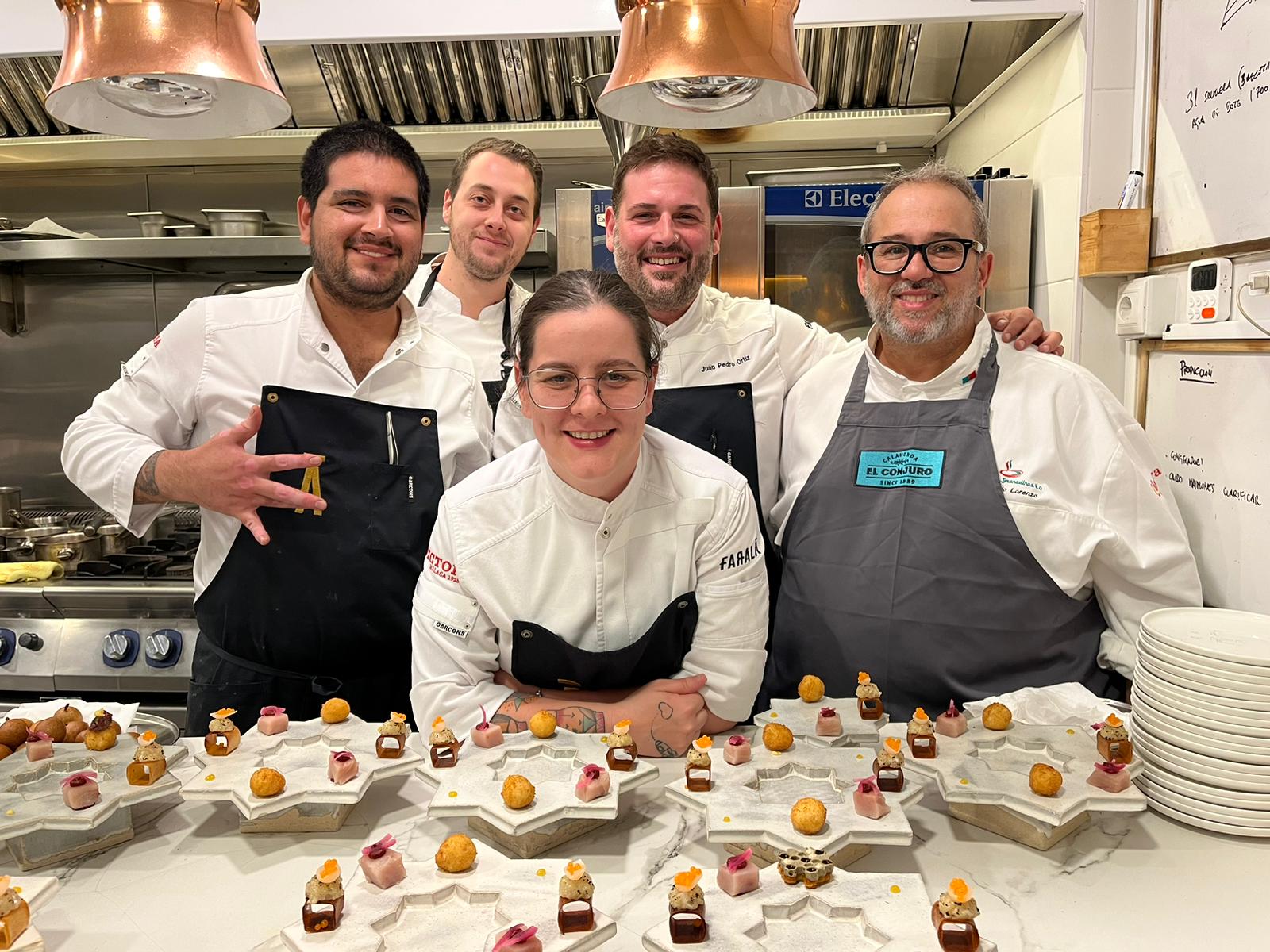 Un nuevo exitoso cuatro manos en Faralá entre Juanpe Ortiz y Antonio Lorenzo, de El ConjuroEsta vez fue 'Por Granaínas'. Ha sido el quinto encuentro de arte y gastronomía que organiza el restaurante Faralá, reconocido con un Sol Repsol, que ... reunió al cocinero local, Juan Pedro Ortiz, con un invitado de excepción, Antonio Lorenzo, cuyos dos restaurantes, El Conjuro de Calahonda y Le Bistró by El Conjuro de Granada, están recomendamos por la guía Michelin. Para Ortiz «ha sido un placer compartir fogones con Antonio, que es un gran profesional que lleva mucho tiempo al frente de una cocina de referencia en Granada y haciendo las cosas bien. Un profesional del que aprender mucho. Uno de mis favoritos en Granada». En justa correspondencia, Antonio Lorenzo manifestó la alegría de disfrutar de una velada tan especial en Faralá, compartiendo la cocina con Juanpe, al que considera un excelente cocinero que está haciendo cosas muy interesantes en la Granada gastronómica contemporánea.