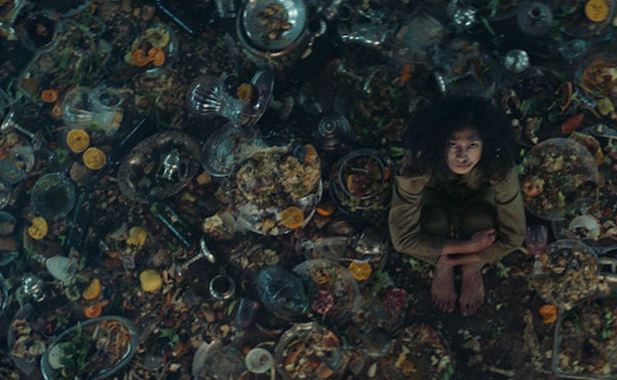 En un momento dado, el protagonista de la película decide enviar un mensaje a quienes están al mando del experimento, mandándoles de vuelta un plato inmaculado y sin tocar de entre los muchos que componen el exquisito banquete diario sobre el que se arrojan los confinados.