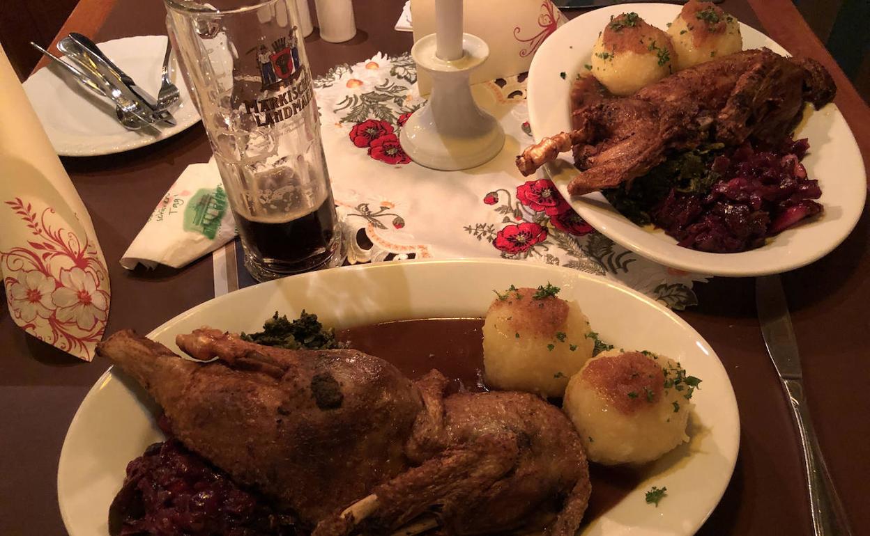 De ahí que, para la última cena antes de volver a España, decidiéramos cambiar de objetivo. En un encantador y acogedor restaurante cuyas mesas estaba situadas en las diferentes estancias de una vivienda, nos aseguramos de pedir una ensalada que fuera una ensalada –tal y como nosotros entendemos la ensalada– y, de segundo, medio pato al horno, con guarnición de acelgas, remolacha y albóndigas de patata. Y, por una vez, tras la primera jarra de cerveza, pedimos un merlot alemán que resultó tan recio y consistente como se podría esperar de un vino tinto germánico.