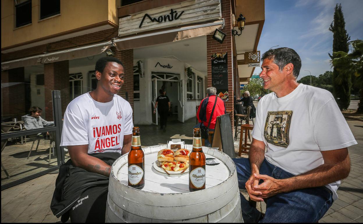 Nos citamos con Thomas Bropleh, que habla un castellano más que aceptable, en el Monti, frente al Palacio de los Deportes. Cada día prepara el almuerzo a los jugadores del Covirán Granada. Casualmente, la tapa que acompaña a la cerveza es una hamburguesa.