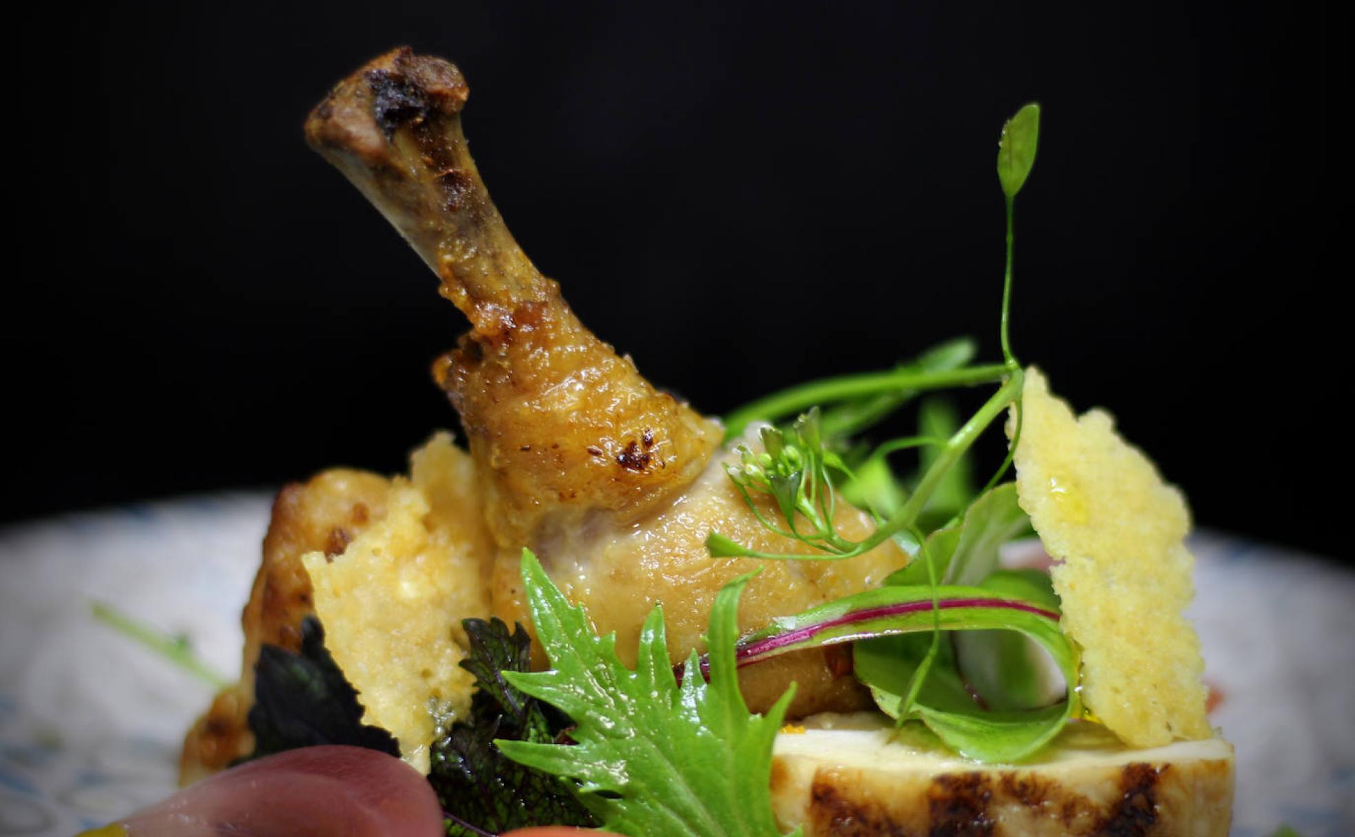Salpimentar los picantones y asar en el horno a 170 ºC durante 25 minutos. Una vez asados, deshuesar y cortar las pechugas en trocitos y limpiar los muslos, reservar hasta el emplatado. Secar el parmesano en el horno durante 35 minutos a 140 ºC, una vez tostado cortar en pequeñas lascas para acompañar la ensalada. Mezclar el yogur natural con una cucharada de mostaza, sal y un poco de aceite de oliva, aderezar la ensalada al momento. Para el montaje, disponer un poco de picantón asado y con la lechuga los picatostes, las lascas de parmesano tostado y aderezar el final con el aliño de yogur y mostaza. ÑamÑam.