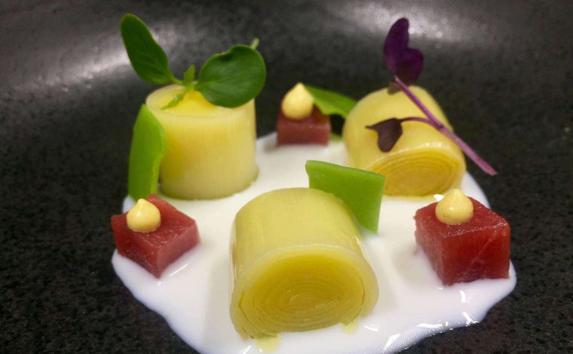 La receta de Marcos Pedraza: ajoblanco, puerros y atún rojo