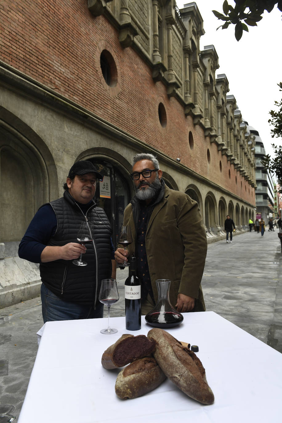 El viñador de San Vicente de la Sonsierra Benjamín Romeo y el panadero artesano Roberto Fernández (Crosta, Zalla) junto a las hogazas amasadas con lías de Contador, posan junto a la antigua Alhóndiga de Bilbao. Romeo nos mostró en una copa el residuo sólido (lías en su origen) presente en una botella de Contador 2009, año en que su tinto empezó a servirse en los Airbus A380 de Emirates (300 € la botella). Este Rioja comestible competirá en unos días en el certamen Madrid Fusión Reale 2020 que organiza la División de Gastronomía de Vocento.
