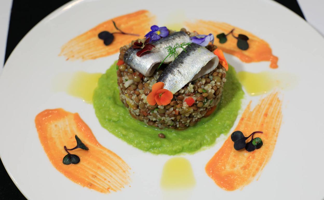 Cocemos por separado las lentejas y la quinoa en agua con sal y un poco de aceite y enfriamos. Pochamos los pimientos, tomates y cebolleta, mezclando todo y salpimentamos. El aguacate lo machacamos con aceite, sal, pimienta y un poco de lima. Metemos las sardinas en agua con sal y vinagre 24 horas. Para emplatar, colocamos primero el aguacate, encima la ensalada de lentejas y, por último, las sardinas. Seguidamente regamos con un poco de aceite y decoramos.