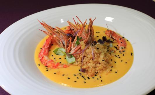 En una olla añadimos los ingredientes del sofrito, añadimos el caldo y cocemos. Añadimos la sal, pimienta y especias y la nata. Trituramos. Colamos por un chino fino y reservamos en la nevera. Los torreznos los trituramos y reservamos también. Maceramos los gambones con el jugo de la lima y el jengibre, una hora, y marcamos a la plancha. Servimos y listo.