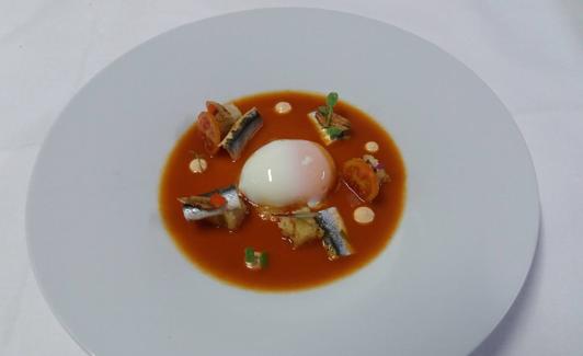 Cortamos las verduras y pochamos. Añadimos el fumet, las especias y dejamos cocer durante 30 min. Trituramos, colamos y dejamos enfriar. Preparamos un escabeche con todos los ingredientes y lo hervimos durante 25 min., corregimos de acidez con un poco de azúcar si fuese necesario. Cuando esté entorno a 60ºC incorporamos los boquerones. Dejamos reposar 24h. Para el huevo poché, cocinar a 64ºC durante 25 min. Presentamos en plato hondo los trocitos de pan empapados en aceite de oliva con un boquerón encima, unos puntitos de mahonesa de kimchee y un poco de huevo rallado.