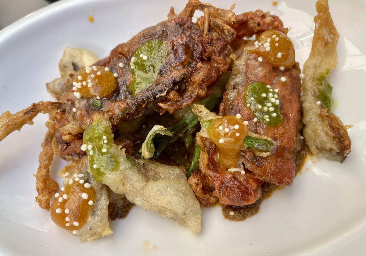 Y lo probamos. Y triunfó. Porque es un platazo. De los de comer con las manos, pringarte y manchurrearte. De los de chuparte los dedos, en sentido figurado, pero también en el literal. Porque ese cangrejo se come entero y a bocados, que no hay que andar bregando con su coraza o el recubrimiento de las patas para chuparlas. Se coge, se lleva a la boca, se mastica y se saborea.