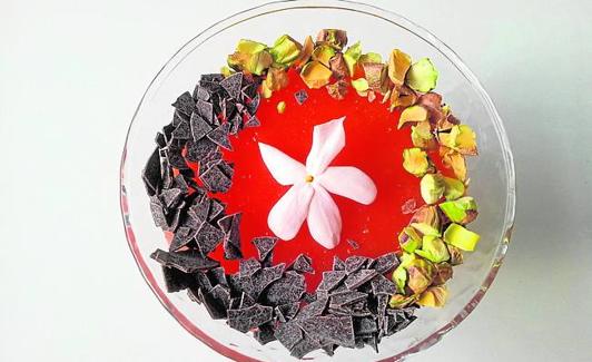 (Por kilo de licuado de sandía): 80 g de maizena, 120 g de azúcar, un espolvoreo de canela, 1 cucharadita de esencia de jazmín (opcional). Decoración: Pepitas de chocolate negro y pistacho sin sal pelado.