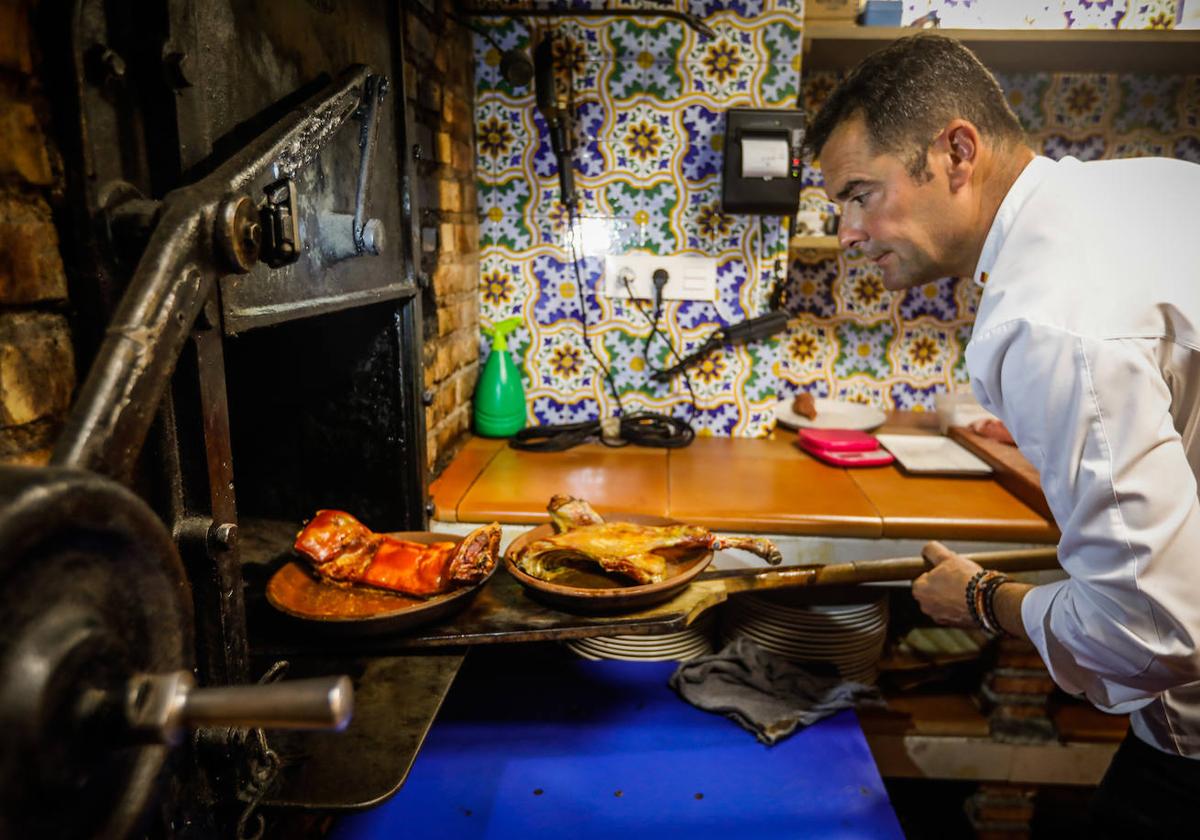 En Asador de la Reina, Sergio trabaja con tres equipamientos esenciales. Por una parte, un horno 'de escopeta', llamado así porque se carga por el lateral. «Es diferente a los hornos castellanos tradicionales ya que la leña no entra en contacto en ningún momento con la cúpula donde se asan las carnes. No se contamina su suelo ni hay resto alguno», explica el maestro parrillero sobre el horno en que asa los cochinillos y los corderos.