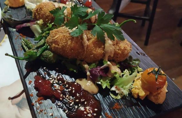 Entre los clásicos de la zona, este croquetón de jamón asado con salsa de Pedro Ximénez y paté de gambas con mermelada de arándanos. Precio 9 euros. Rhin Barril. Calle Torre de los Hidalgos, 1. Teléfono 958 183 771