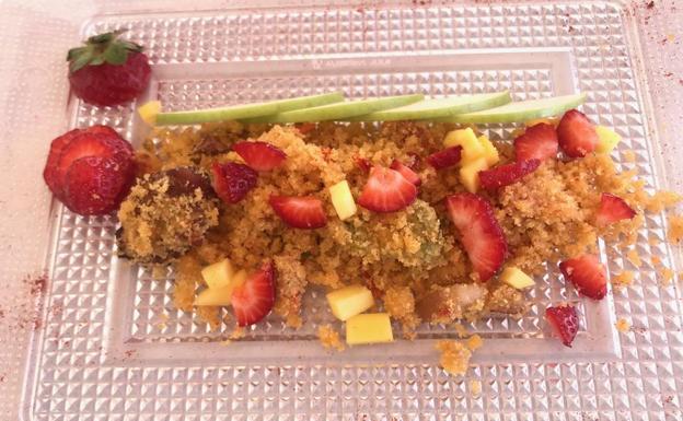 Estas migas de sémola de trigo con mango, fresas y manzana verde resultan un bocado fresco muy agradable que se agradece en los almuerzos de ... Corpus.