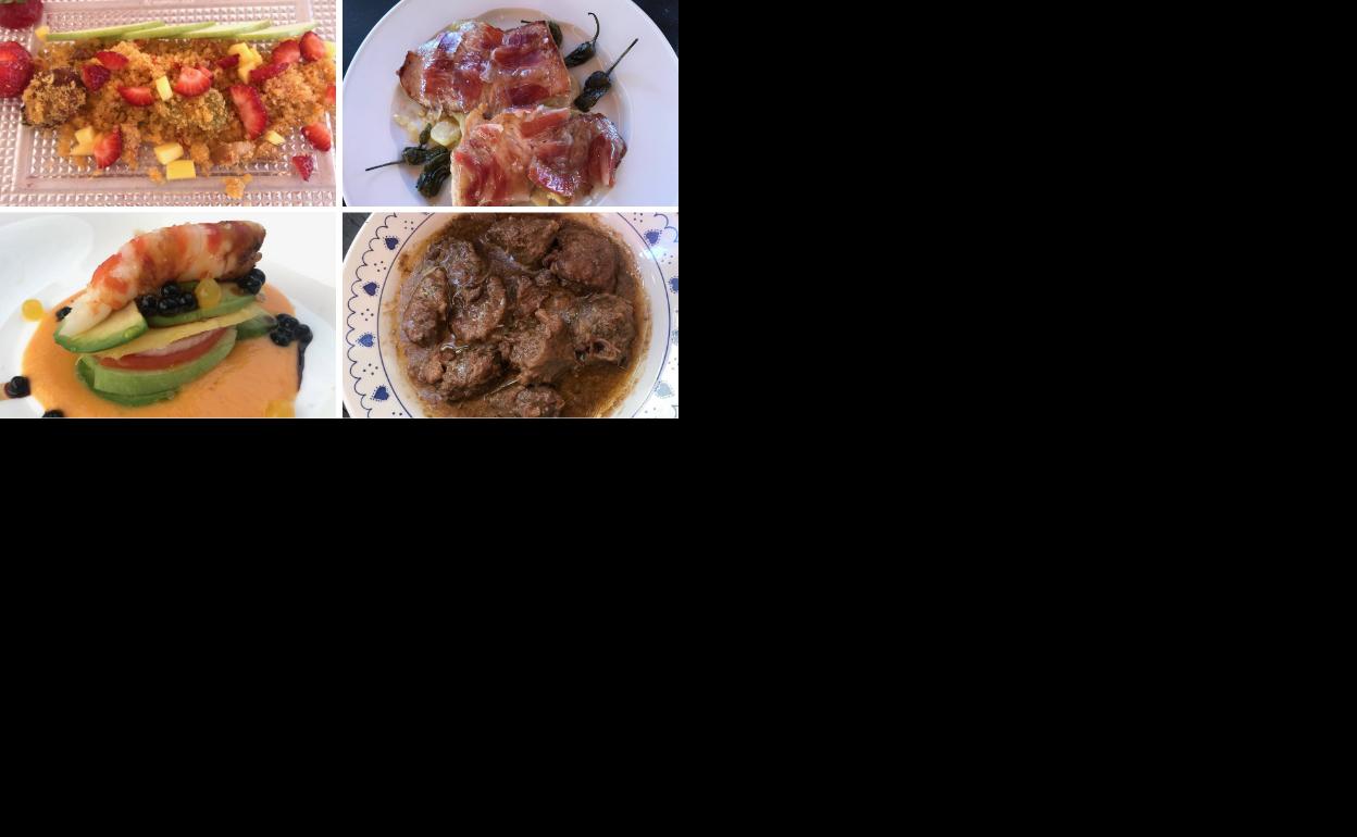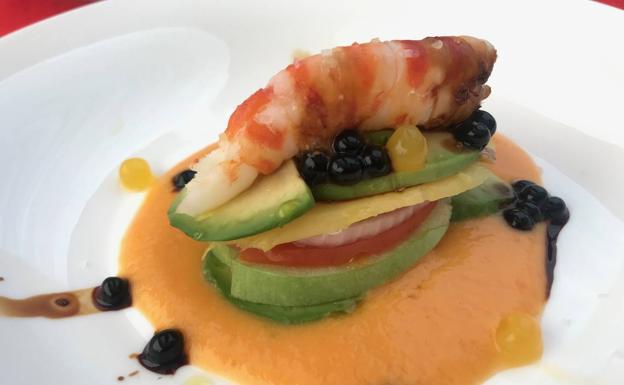 Una propuesta fresca para aliviar los días de calor intenso de este Corpus. Milhojas de aguacate , manzana verde, tomate y mango con salmorejo de mango tropical.