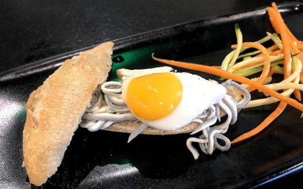 Este minipan, galleguito, con gulas salteadas y huevo de codorniz es una de las tapas más demandadas en la soleada terraza próxima a la estación de autobuses. Precio incluido en la consumición. Calle Ovidio s/n. Teléfono 958 15 72 39