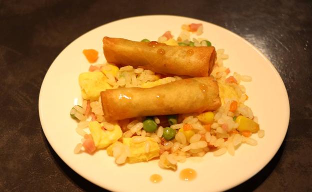 Entre sus tapas nada habituales, ésta propuesta del día. Un arroz tres delicias con tortilla, zanahoria, guisantes... y dos minirollitos de primavera. Precio de la ... tapa incluido en el de la consumición.